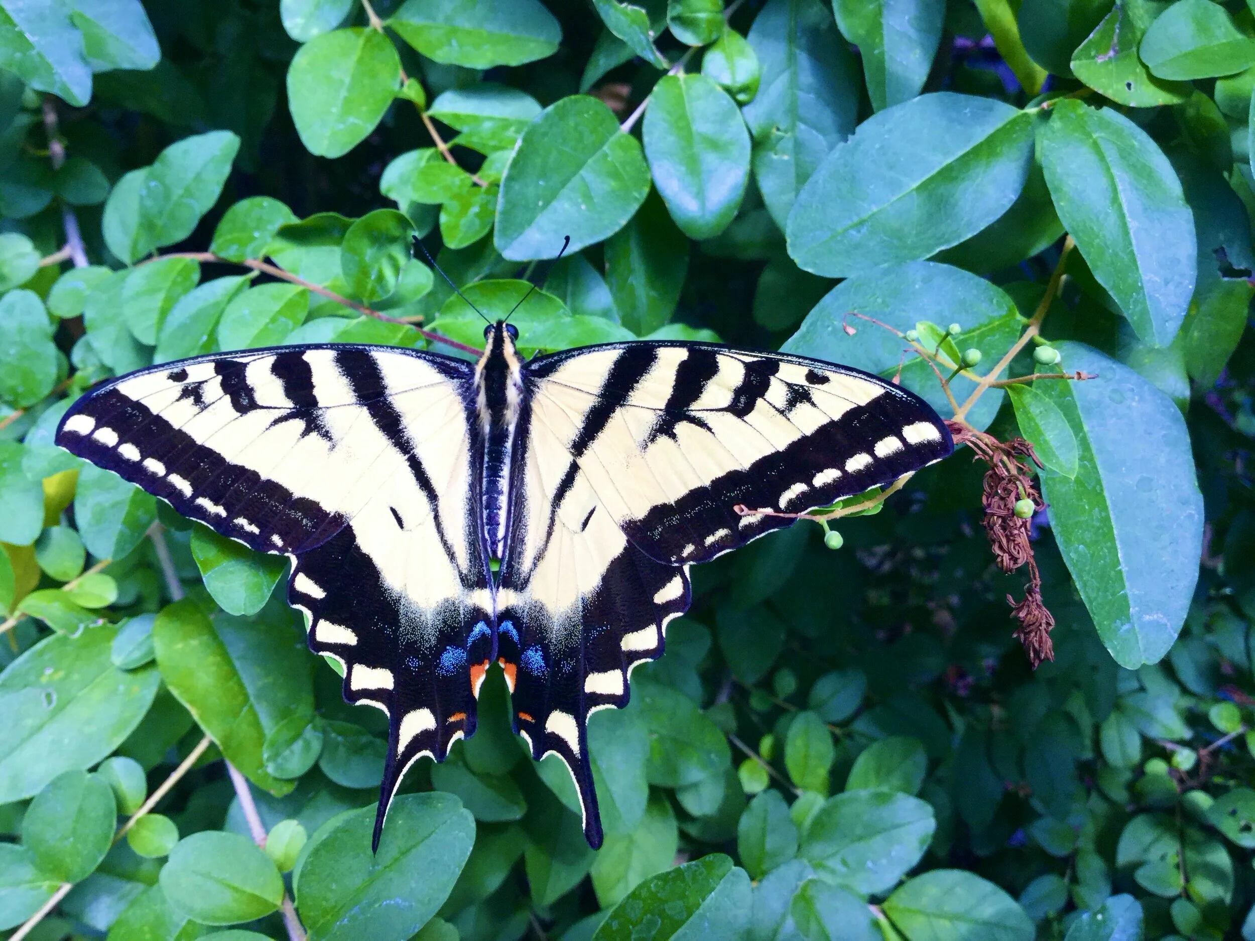 Because we don’t use pesticides, we have lots of insect visitors in our garden. Some are welcome guests and others we ask our bouncers, (the lizards), to take care of. The other afternoon while our grandsons were visiting, we found two great examples of camouflage - the lizard blending in perfectly with the old railroad tie, and the praying mantis hiding in the green beans. Preferring to show off, this eastern tiger swallowtail butterfly posed long enough for me to capture a great photo!